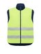 Reversible work vest. One side is electric green with reflective strips, and the other side is navy.  The vest has multiple pockets. Certified according to European Union Requirements