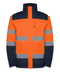 Men's waterproof work jacket with reflective strips. The jacket has a high collar, hood and removable sleeves. It has 3 pockets with a zipper. Certified according to the requirements of the European Union.